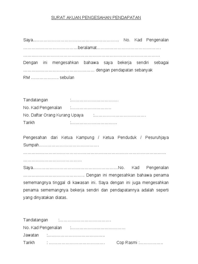 Individu yang bekerja sendiri dan tidak mempunyai slip gaji ingin membuat pengesahan pendapatan, anda boleh download surat akuan pengesahan .